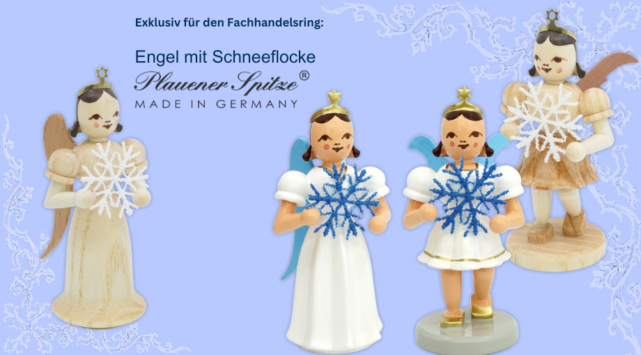 Mit dem Engel mit Schneeflocke wird die Figurengruppe „Weihnachtstraum“ um eine handwerklich besondere Ausführung ergänzt. Die Schneeflocke aus Plauener Spitze verbindet erzgebirgische Holzkunst mit einer zweiten, traditionsreichen Handwerkskunst und verleiht der Figur einen eigenständigen Stellenwert innerhalb der Serie. Der Engel mit Schneeflocke trägt die Artikelnummern EK-M 018, EKF-MF 018, ELF-MF 018 und EL-M 018.