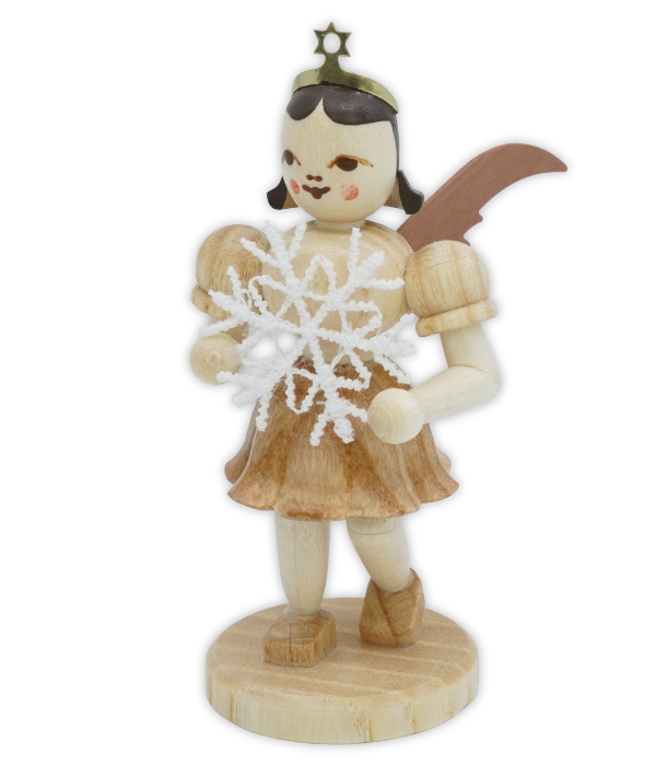 Mit dem Engel mit Schneeflocke wird die Figurengruppe „Weihnachtstraum“ um eine handwerklich besondere Ausführung ergänzt. Die Schneeflocke aus Plauener Spitze verbindet erzgebirgische Holzkunst mit einer zweiten, traditionsreichen Handwerkskunst und verleiht der Figur einen eigenständigen Stellenwert innerhalb der Serie. Der Engel mit Schneeflocke trägt die Artikelnummern EK-M 018, EKF-MF 018, ELF-MF 018 und EL-M 018.